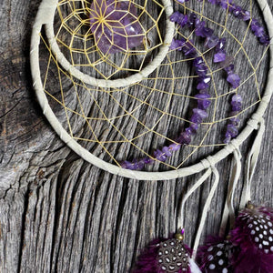 A stunning dreamcatcher loaded with amethyst gemstones! Amethyst is a meditation stone with aid of healing and addictions.