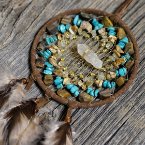 • Detailed with tiger eye, turquoise, citrine and picture jasper semi-precious stones and a quartz crystal in the center