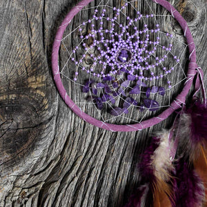 Bright & colourful. This dreamcatcher is adorned with purple seedbeads and detailed with amethyst stone chips.