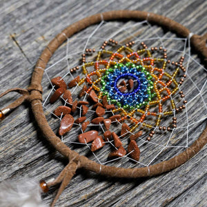 Stunning & vibrant. This dreamcatcher is adorned with colourful glass seedbeads and detailed with red goldstone semi-precious gemstones.