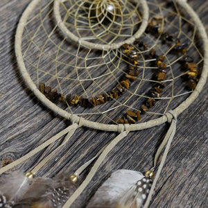 A stunning dreamcatcher loaded with tigereye gemstones! Tigereye is for grounding, protection and integrity.