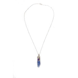 A beautiful blue kyanite with amethyst point pendant on a sterling silver chain. This one stands out! Kyanite is a meditation stone and grounding stone and promotes honesty, loyalty and calmness.