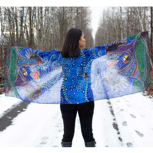 A gorgeous scarf/shawl with vibrant blue, green and red colours. Also has the medicine wheel in it.